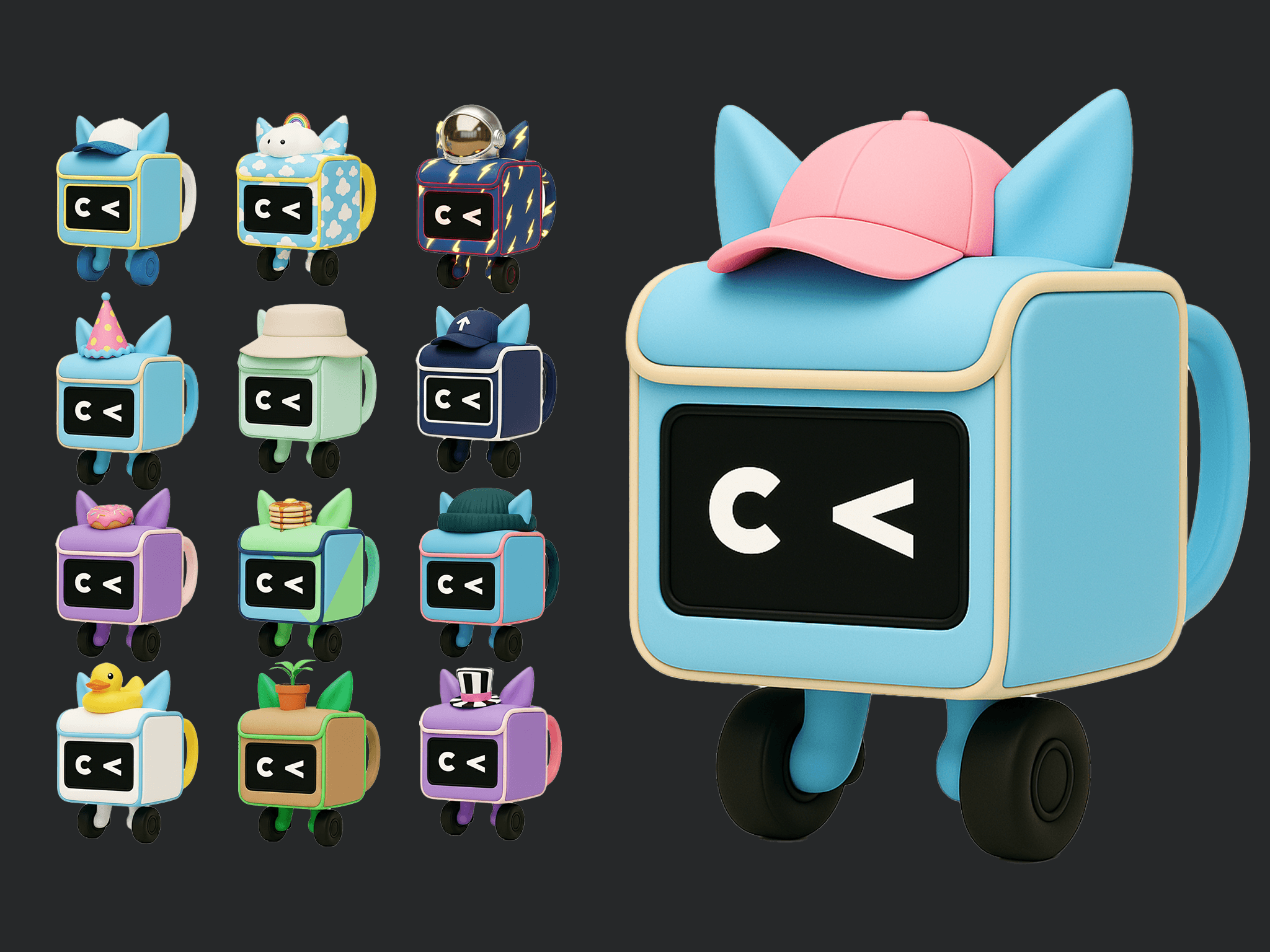 The final design: a backpack with cat ears, a hat nestled between them, the C< logo from CourierVerse as its face, and little wheels for feet. Simple enough to spawn endless variants, distinctive enough to feel like a character.