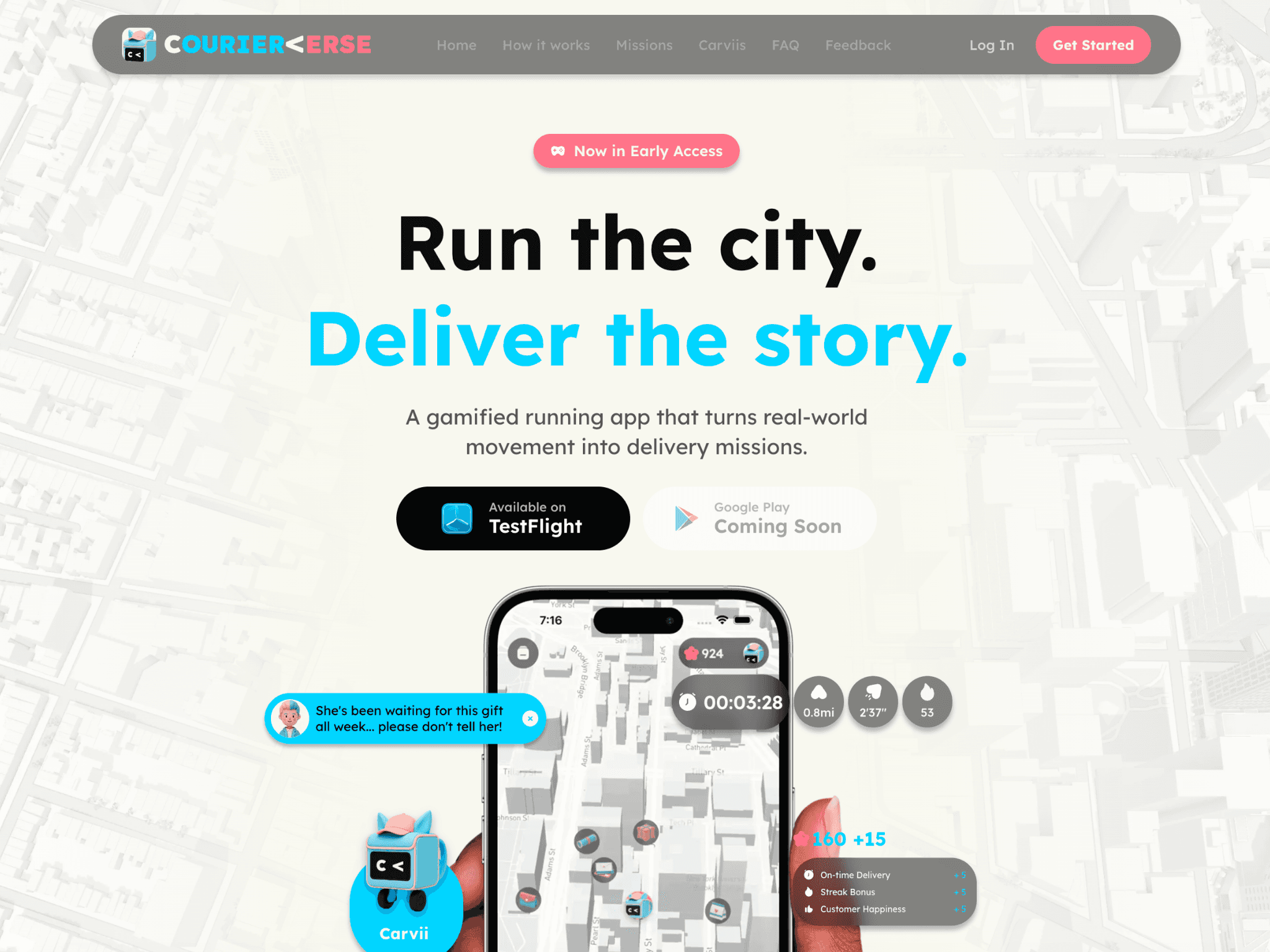 Carviis are the collectible companions that keep players running. Each one is a blind-box surprise — earned with coins from deliveries.