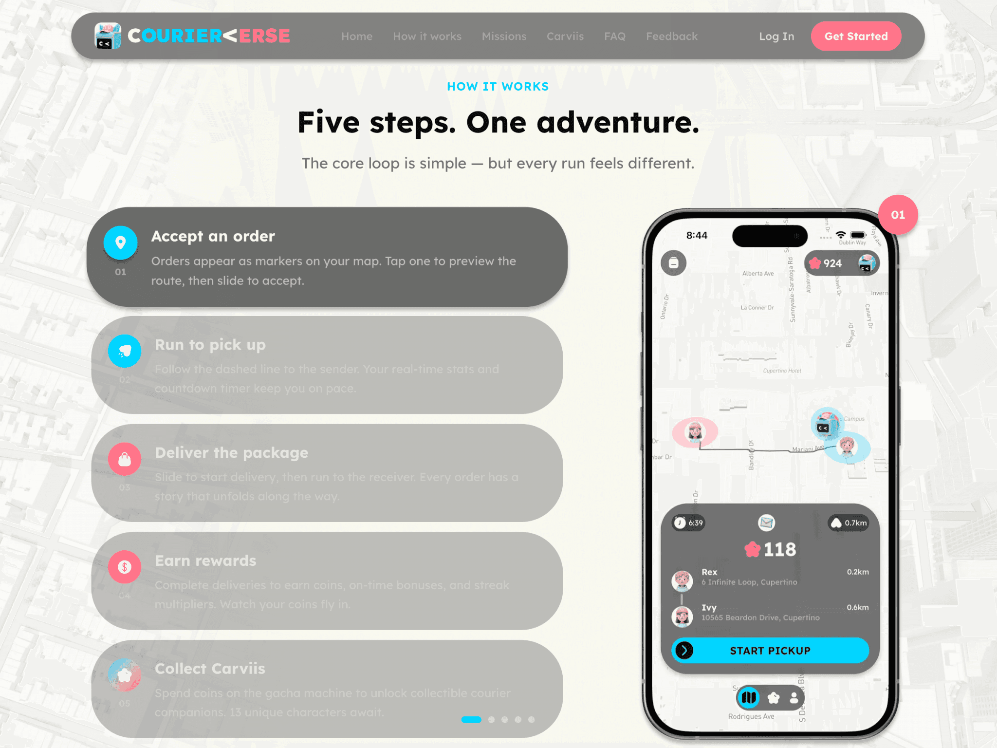 Early versions had a retro RPG aesthetic — pixel backgrounds, fantasy vibes. But testing revealed it created distance rather than immersion. The delivery concept works best when it feels like a second life, not a separate fantasy world. The pink-and-blue palette was a deliberate choice to feel trendy and game-like, standing apart from the dark athletic look of mainstream running apps.